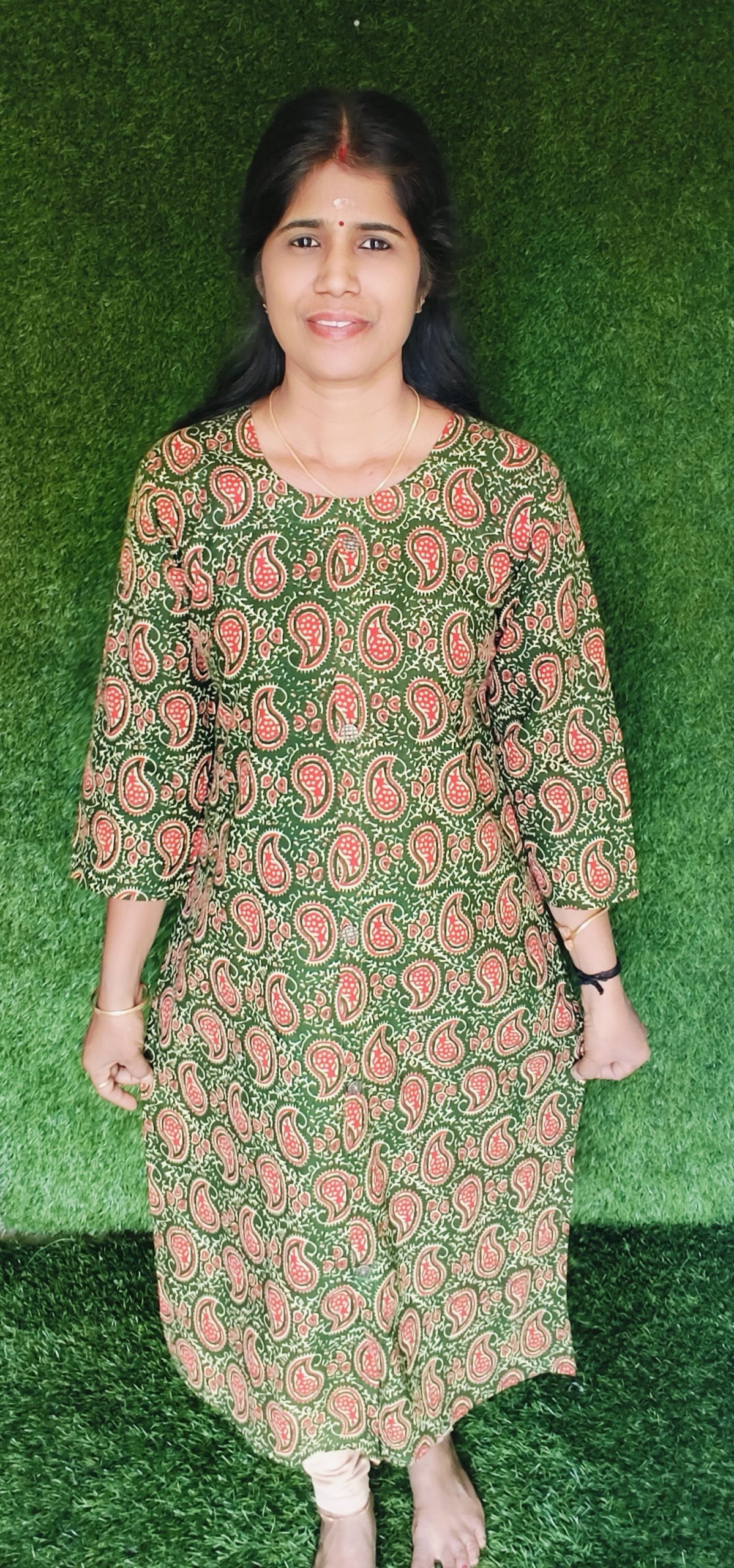 Comfortable and stylish daily wear kurti made from soft cotton Ajrakh fabric in an attractive green and red color combination. Designed with a relaxed plus-size fit and side opening, making it practical and comfortable for everyday use. Perfect for casual outings and daily wear.